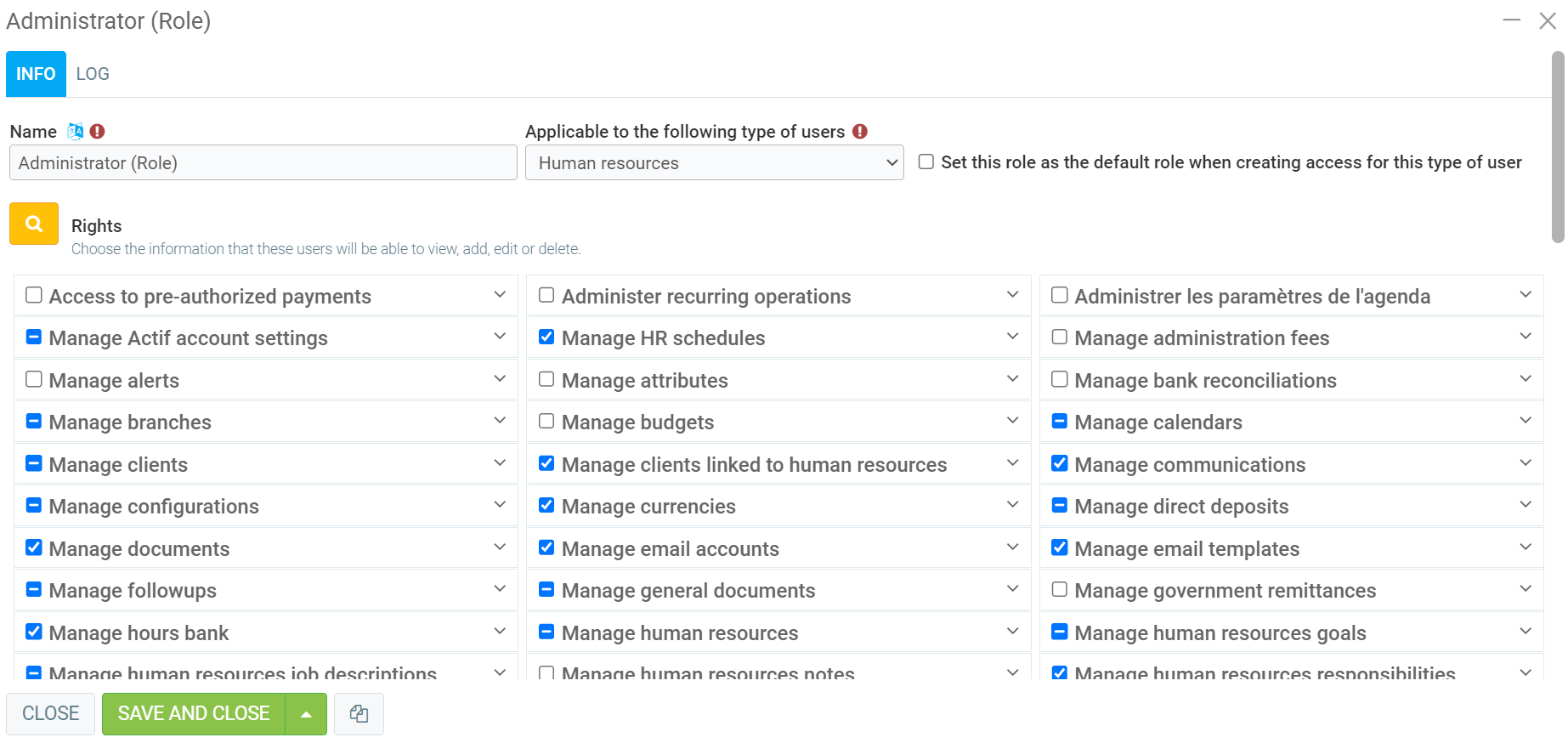 Click on the role you wish to modify. In the window that appears, you can check the boxes corresponding to the accesses you wish to grant to this role.