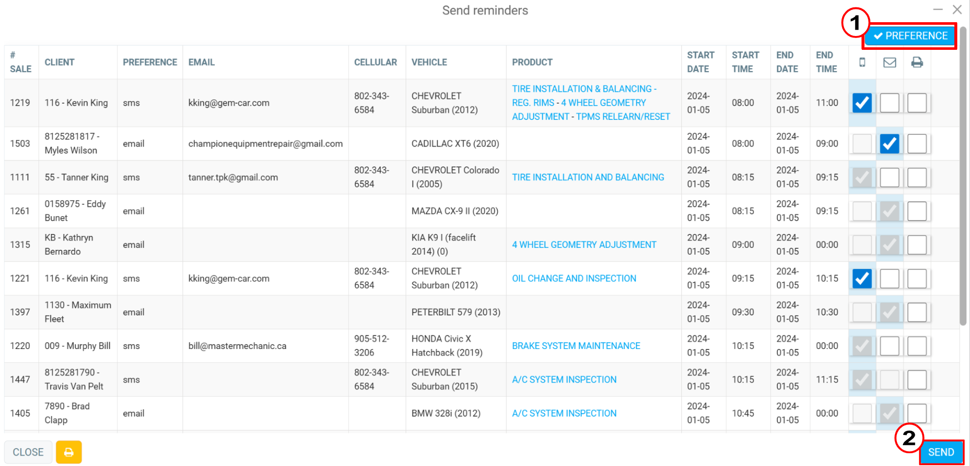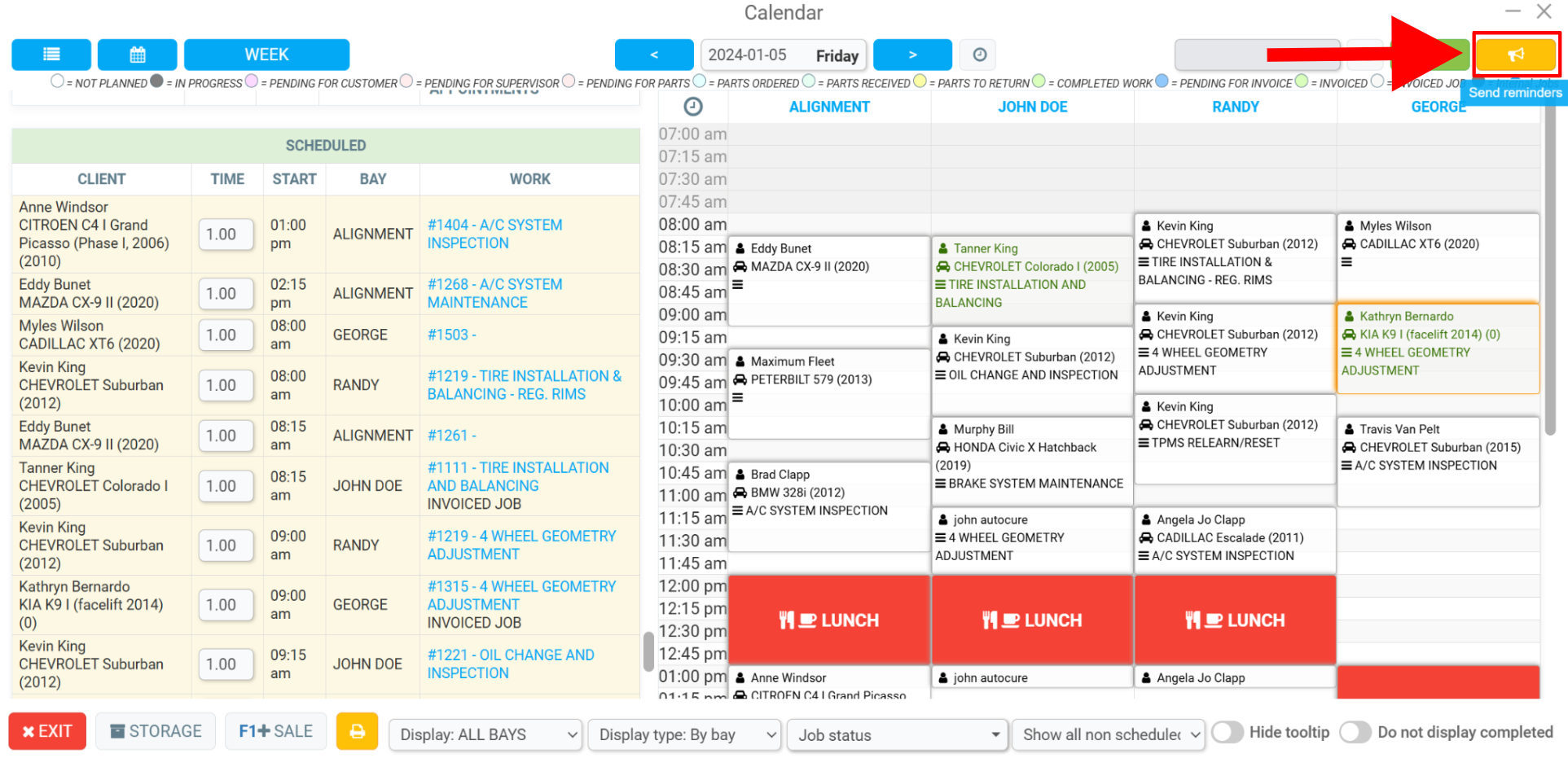 Open your GEM-CAR and select Calendar from the menu on the left. Then click on the yellow speaker in the upper right corner of the screen, the Send Reminders button, next to the green Refresh button.