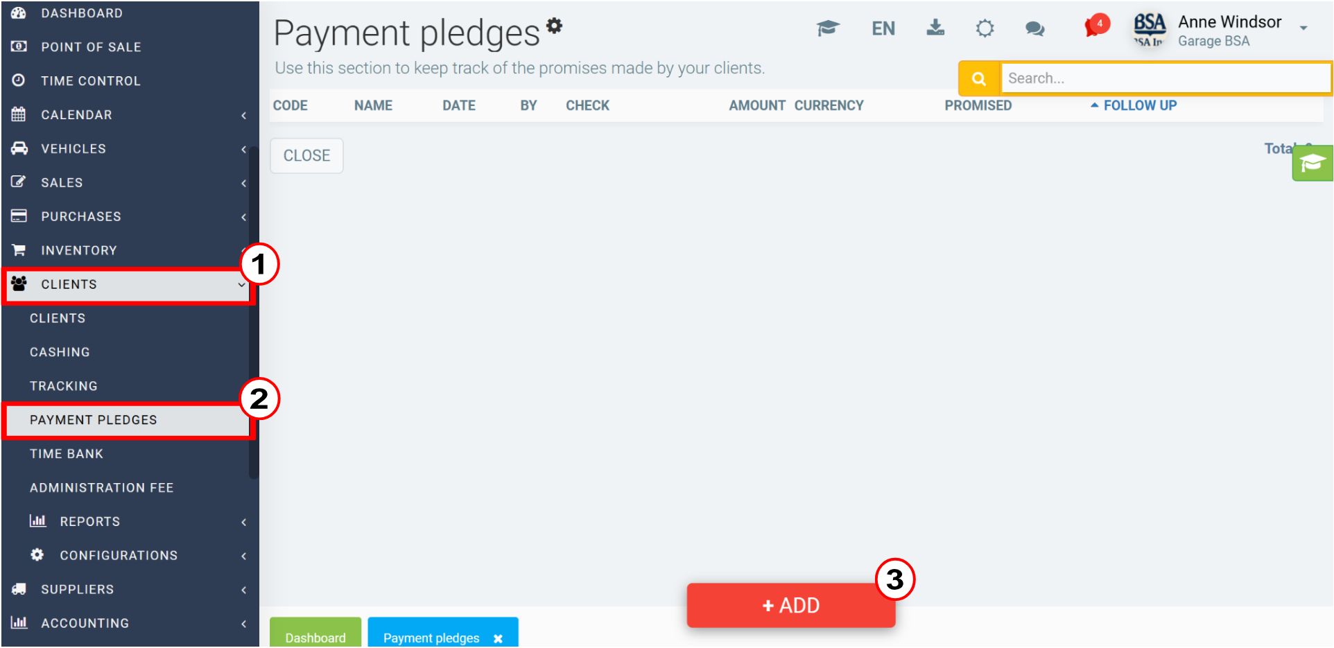 Click on Clients > Payment pledges > +Add.