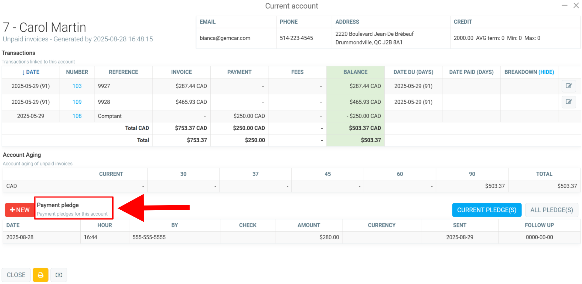 The payment promise system makes it easy to track your clients' payment commitments. You can access it in two ways: via the Clients > Payment Pledges menu or directly in the Current report on a client's file. This module centralizes all invoices for which a client has made a payment promise and allows you to enter and view this information quickly and easily.