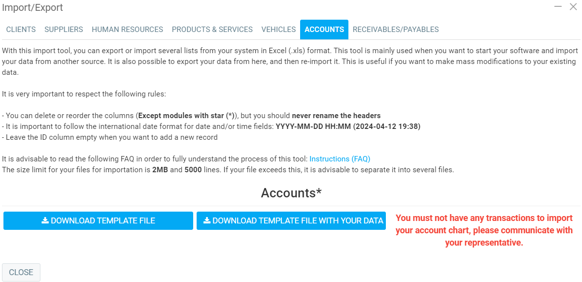 In the case of Accounts, if you want to download the template file containing the current system data, select the Accounts tab and click on Download template file with your data.