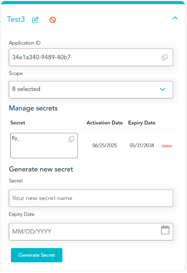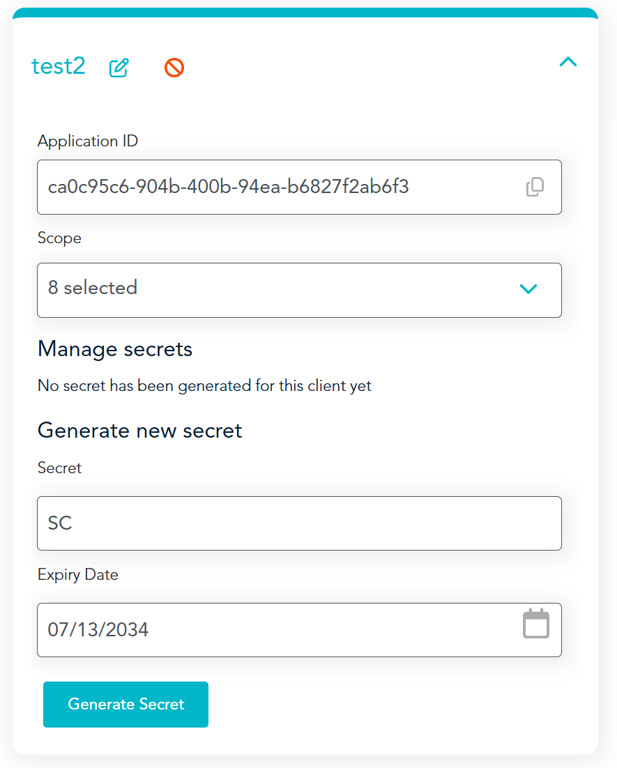 A new line will be added to your client and another important piece of information will appear: the secret (important for GEM-CAR), with an activation and expiry date.