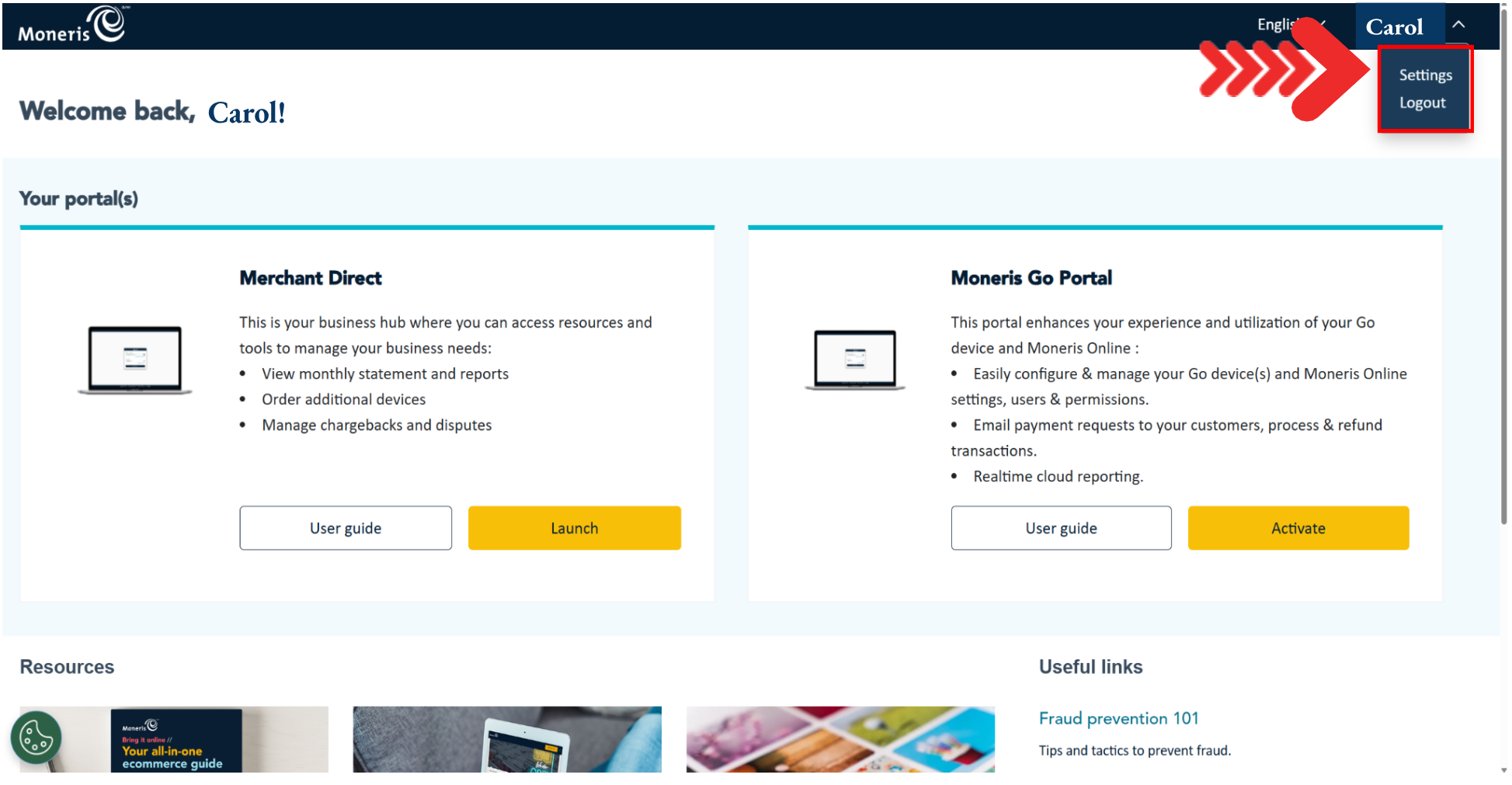 On the Moneris portal page, click on the username in the top right corner of the screen and click on Settings.