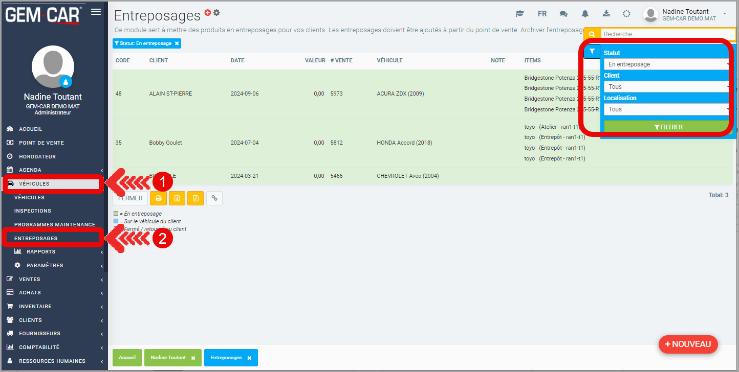 Alternatively, from the main menu on the left of the application, click on Vehicles > Storage.