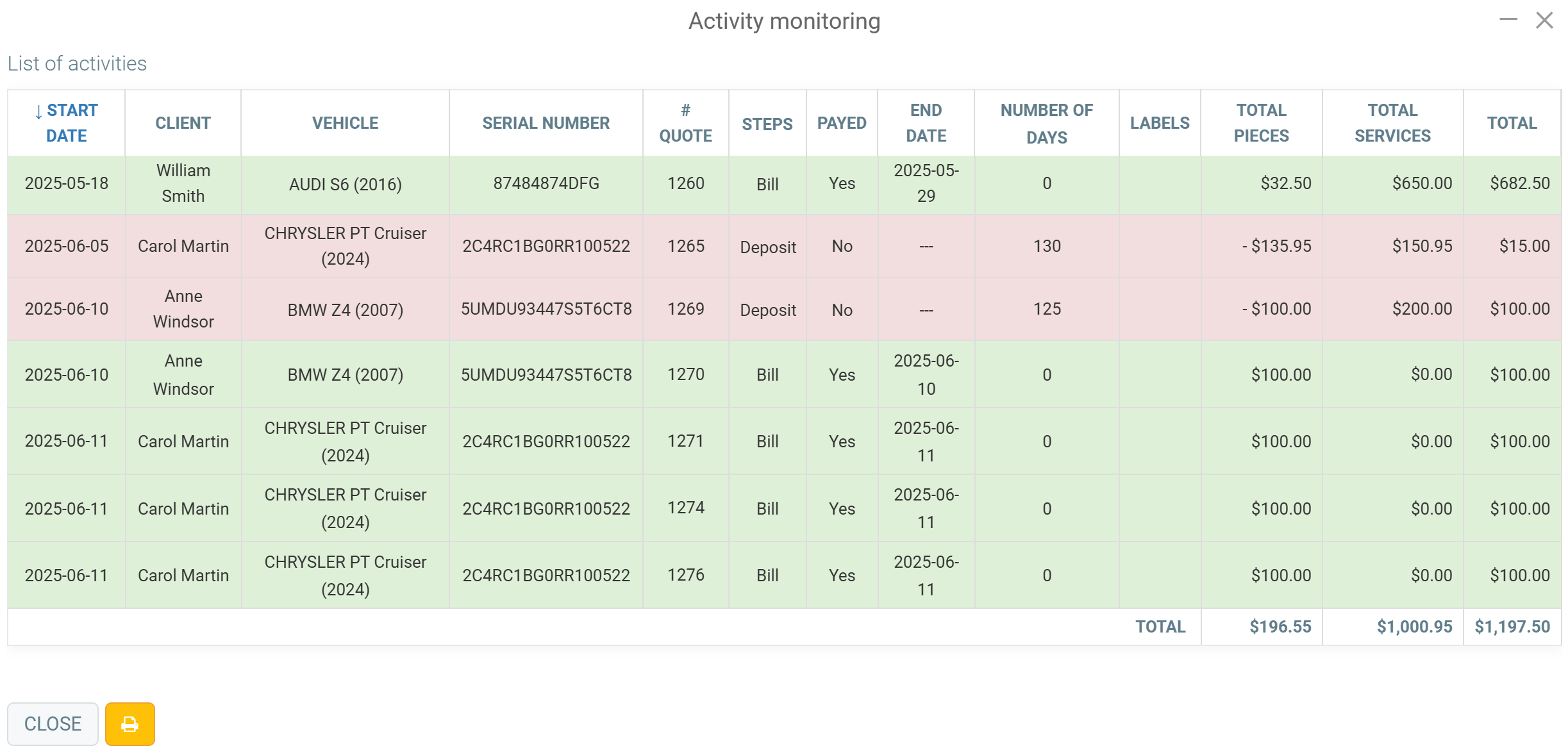 To find out the costs of each service performed on each vehicle, you can consult the history in each vehicle's file in your GEM-CAR, whether it is a client's vehicle, a vehicle you are lending, or a courtesy vehicle.