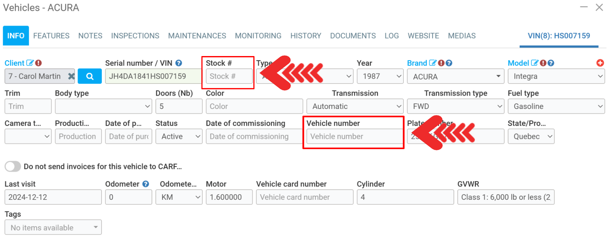 In the Info tab, you can check the Stock #, between Serial number/VIN and Type.