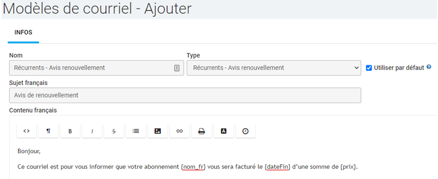 - Si vous désirez envoyer le courriel pour les clients qui n'ont pas de méthode de paiement de configurés sur leurs fiches (onglet termes), vous devez créer un modèle de courriel du type Récurrents - Avis renouvellement.