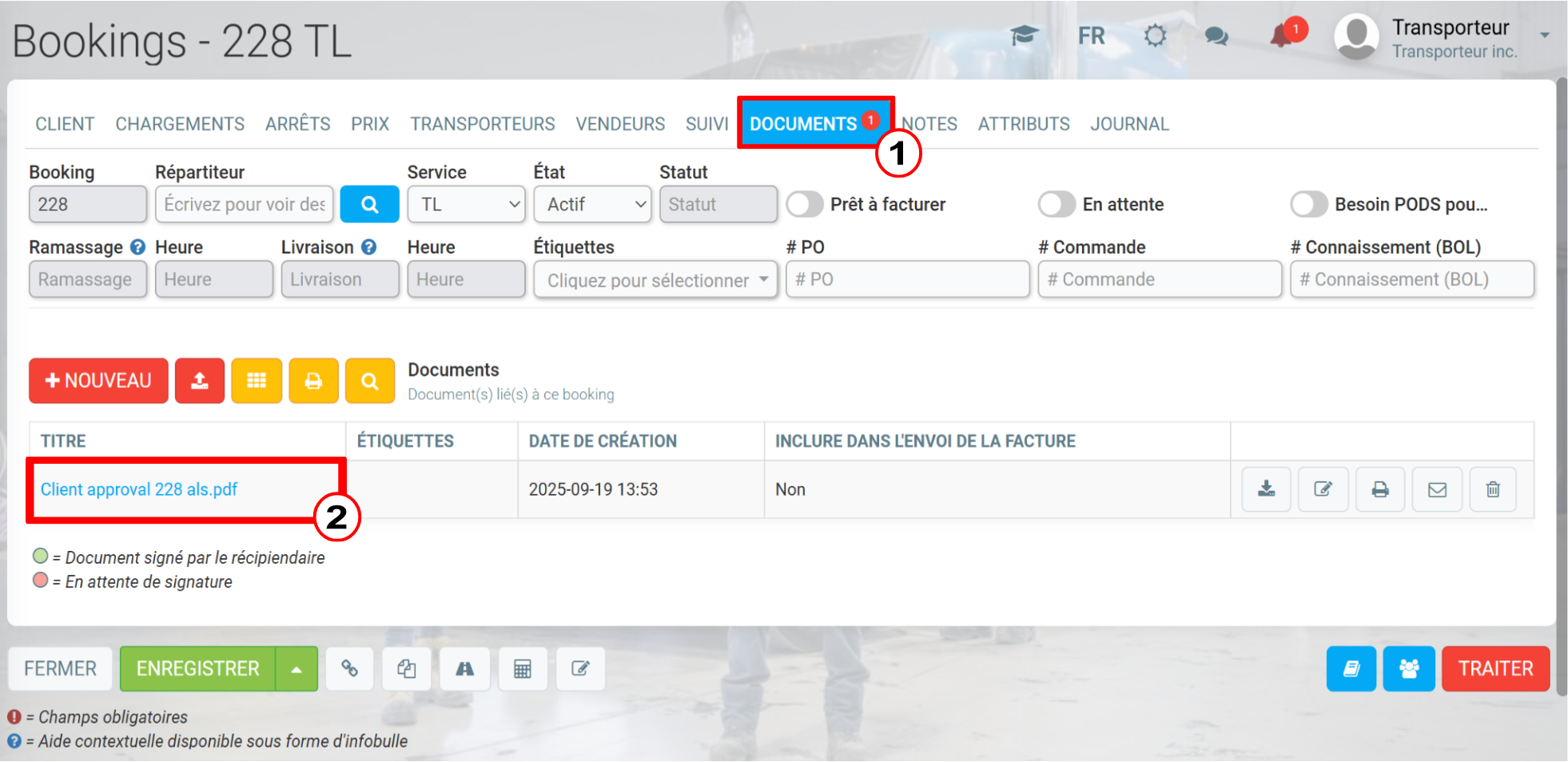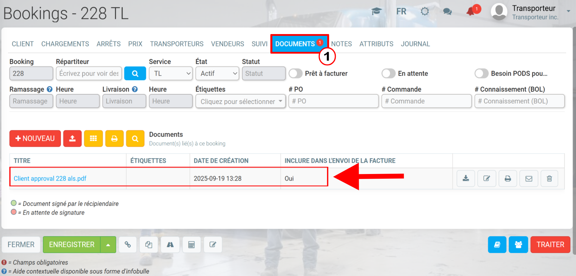 Dans la liste Bookings, dans l'onglet Documents, sélectionnez le document que vous souhaitez envoyer.