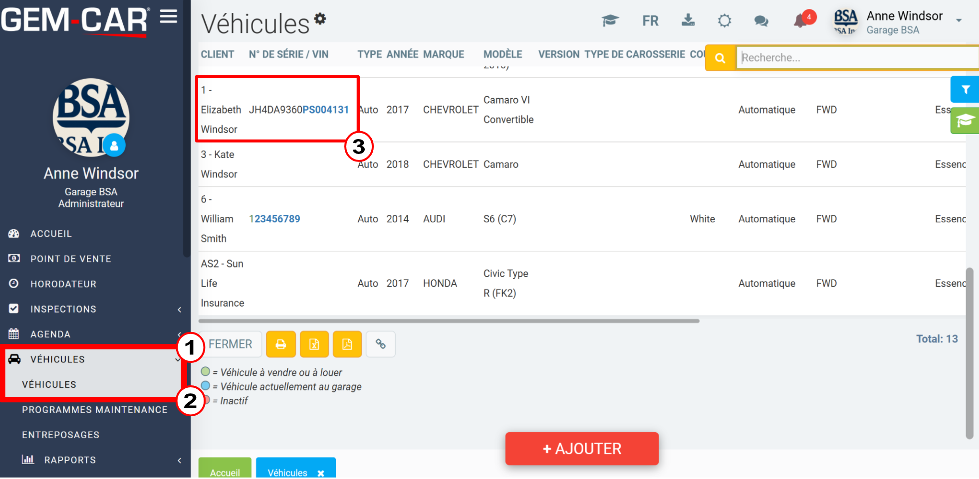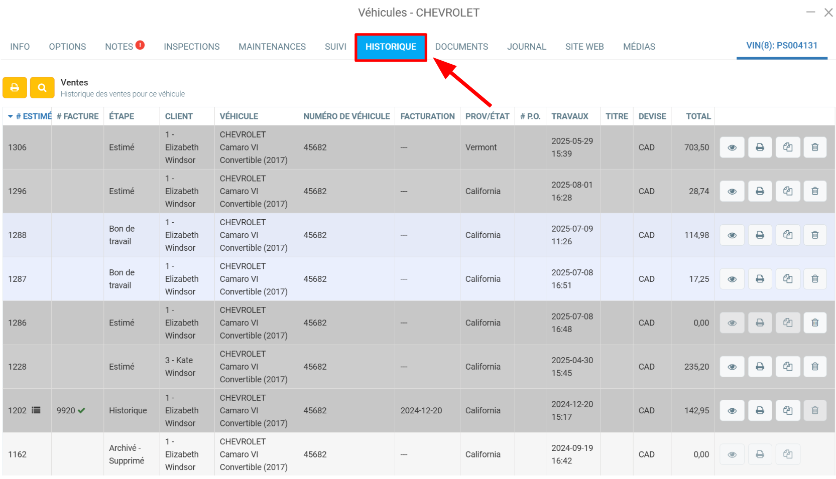 Pour connaître les coûts de chaque service effectué sur chaque véhicule, vous pouvez consulter l'historique dans la fiche de chaque véhicule dans votre GEM-CAR, qu'il s'agisse d'un véhicule d'un client ou d'un véhicule que vous prêtez, d'un véhicule de courtoisie.