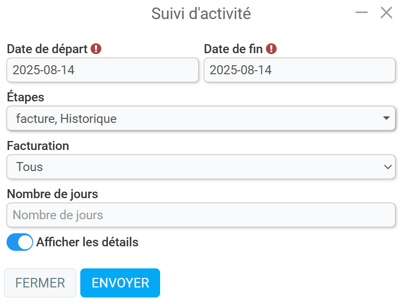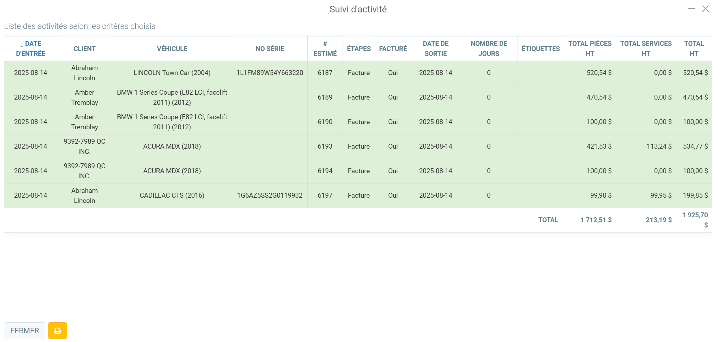 Mais si vous souhaitez obtenir un sommaire des valeurs des services effectués à certaines dates, pour tous les véhicules, cliquez sur Véhicules > Rapports > Suivi d'activité.